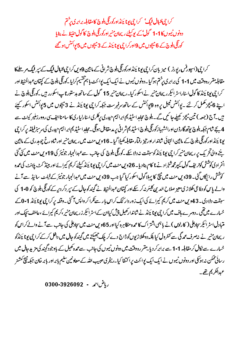 Table topper Korangi Baloch have 9 points from 6 games while Karachi United have 5 points from 3 games. The match supervised by referees Habibullah, Babar Khan and Saleem Babar and Match Commissioner was Abdul Karim.