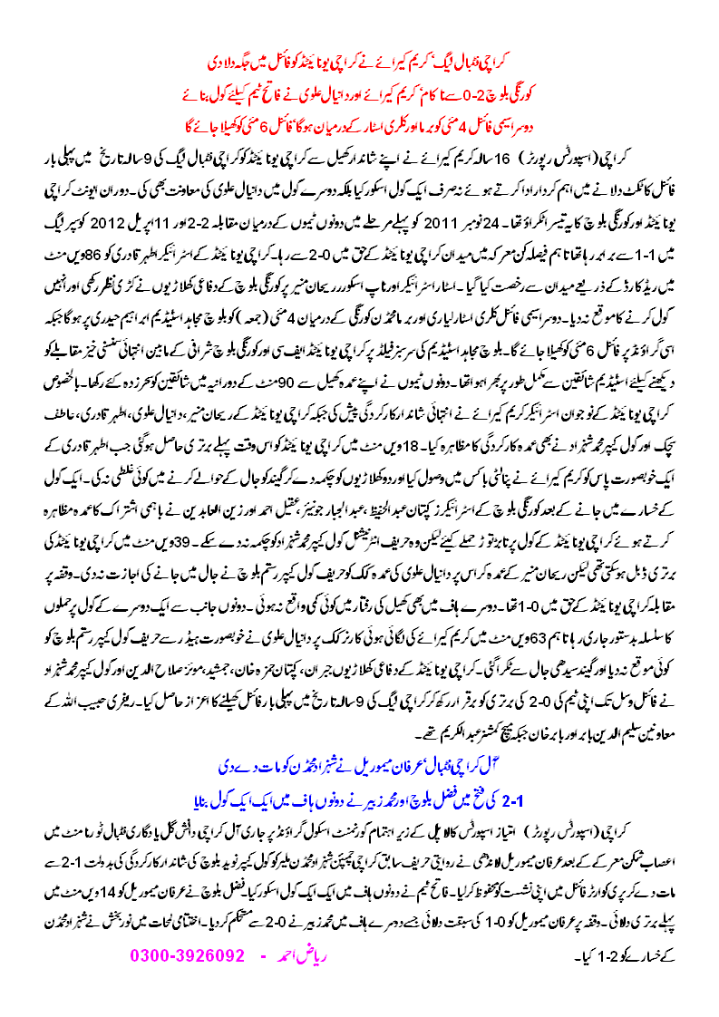 At the final whistle, Karachi United was all smiles with their first ever appearance in the final of 9th edition of Karachi Football League. Referees were Habibullah, Saleemuddin Babar and Babar Khan and Match Commissioner Abdul Karim.