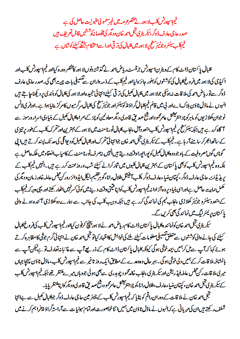 The club also enjoys prominence with the Punjab Football Association, and it recently provided office space to the cash-strapped Punjab FA in recent months to help it manage the affairs of the province efficiently. Punjab FA’s secretary and member of the Pakistan Football Federation (PFF) general congress Khalid Mehmood Chaudhry was also present in Riaz Ahmed’s visit and had in depth conversations over the affairs of PFA.
