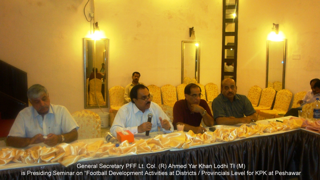 “Since 2004 Pakistan Football Federation (PFF), under the dynamic leadership of Makhdoom Syed Faisal Saleh Hayat, had been carrying out all football activities centrally based upon PFF Annual Calendar. Resultantly, PFF was able to carry out 30 times more activities in last 8 Years as compared to the corresponding eight years of the old PFF set up”. This was stated by General Secretary PFF, Lt. Col. ® Ahmed Yar Khan Lodhi TI (M) in a seminar on “Football activity at District/Province level for Khyber Pakhtunkhwa (KPK)” at Shelton’s Green Hotel, Peshawar Cantt. Peshawar.