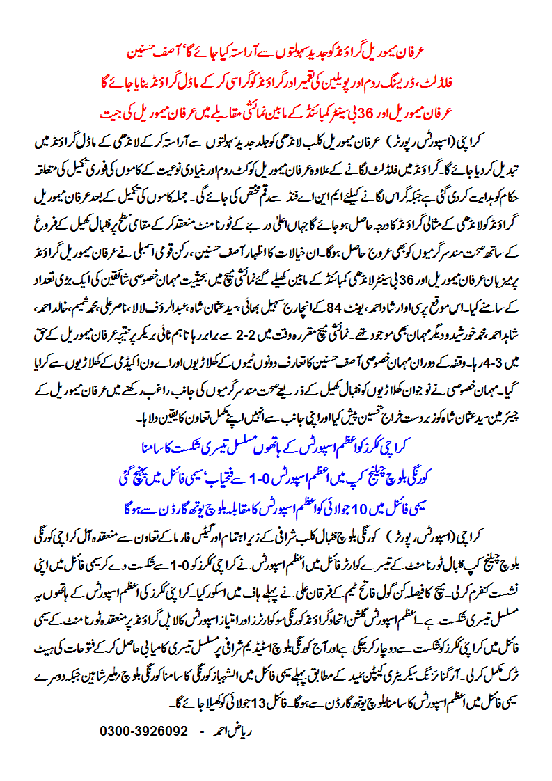 Syed Asif Hasnain told the audience that funds will be released from his MNA fund to help the club install latest facilities at the ground, including floodlights, kit room, and a pavilion to give the Irfan Memorial Ground a more professional look to host tournaments in future as Irfan Memorial is one of the top football teams of Landhi, Karachi.