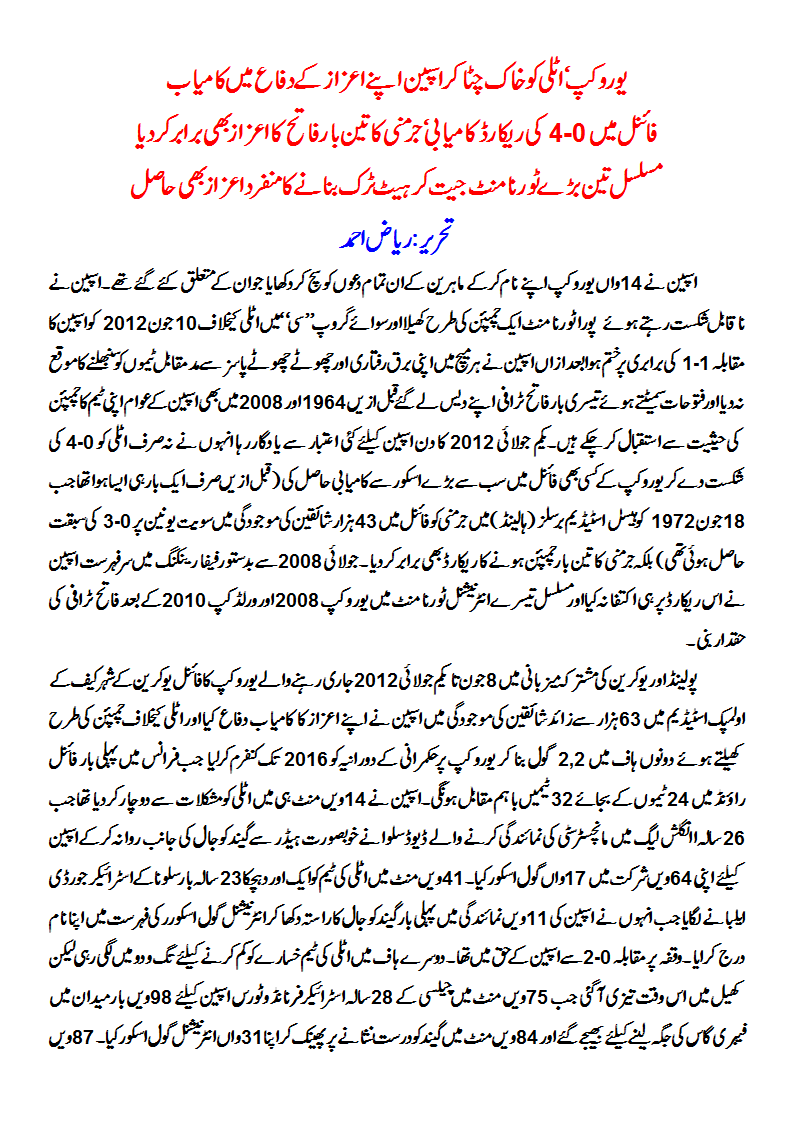 July2July 2, 2012Spain retain European crown after emphatic victory [Urdu]By Editorial StaffIn International Competitions