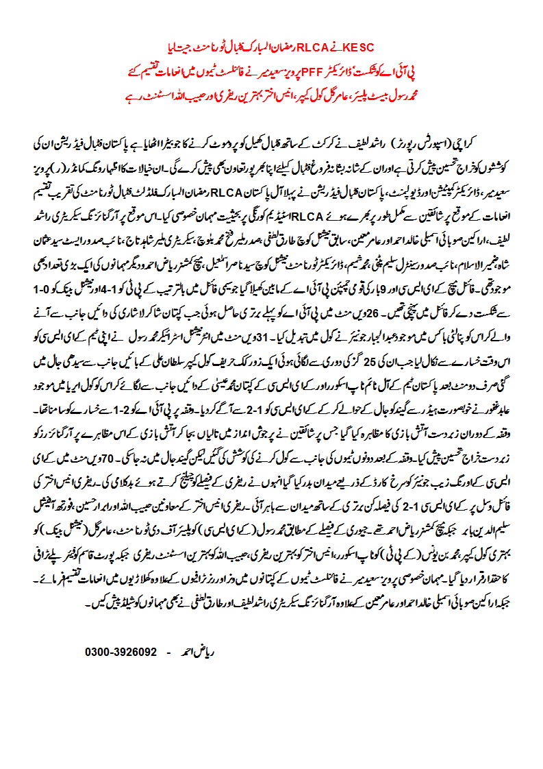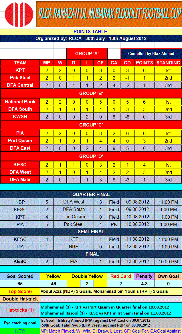 Karachi Electric Supply Corporation (KESC) defeated 9 time national football champions Pakistan International Airlines (PIA) 2-1 in the final of 1st All Pakistan RLCA Ramzan ul Mubarak Flood-lit Football Cup at the RLCA Stadium in Korangi#5, Karachi yesterday night 13 August 2012.