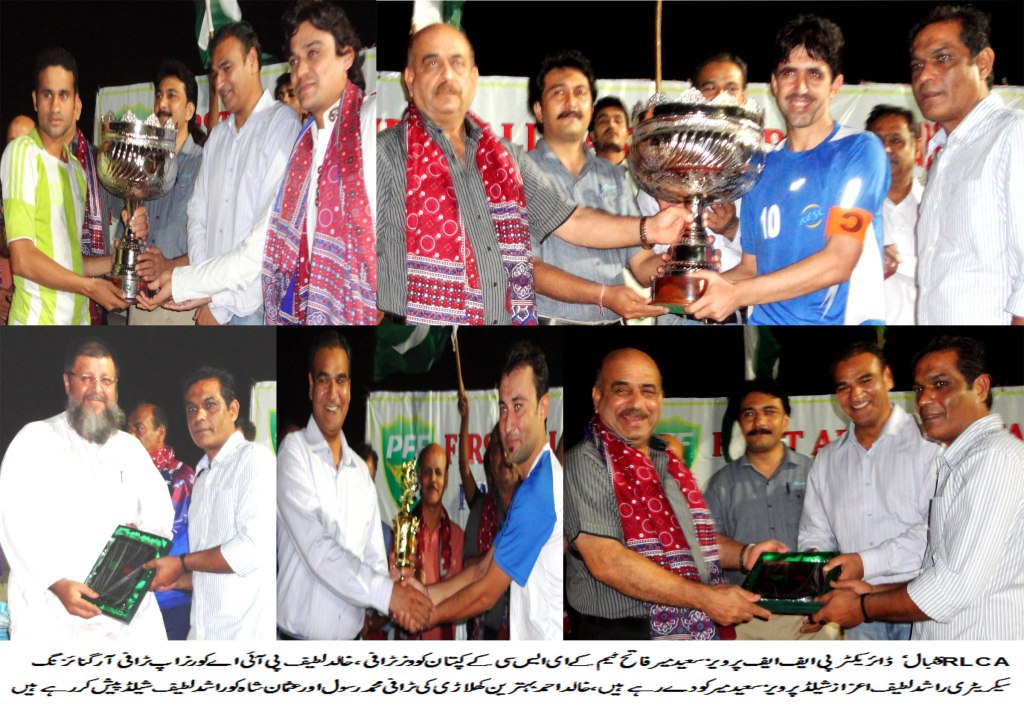 WC (R) Pervaiz Saeed Meer, Director Competition and Development of Pakistan Football Federation presented Winner and Runner up trophies to the respective captains and also distributed the prizes amongst the players. Organizing Secretary Rashid Latif presenting Shields to the guests. Mr. Amir Moeen Pirzada, MPA, Mr. Khalid Ahmed MPA, Mr. Tariq Lutfi, Ex National Coach, President DFA Malir Fateh Mohammad Baloch, Secretary Shahid Taj, Vice Presidents of DFA East Mr. Syed Usman Shah and Zamirul Islam, Vice Presidents DFA Central Saleem Patni and Mohammad Shamim, Director Tournament Syed Nasir Ismail, are also present on the occasion.
