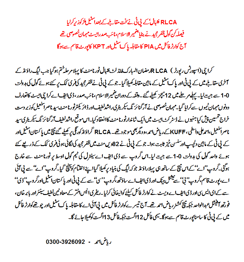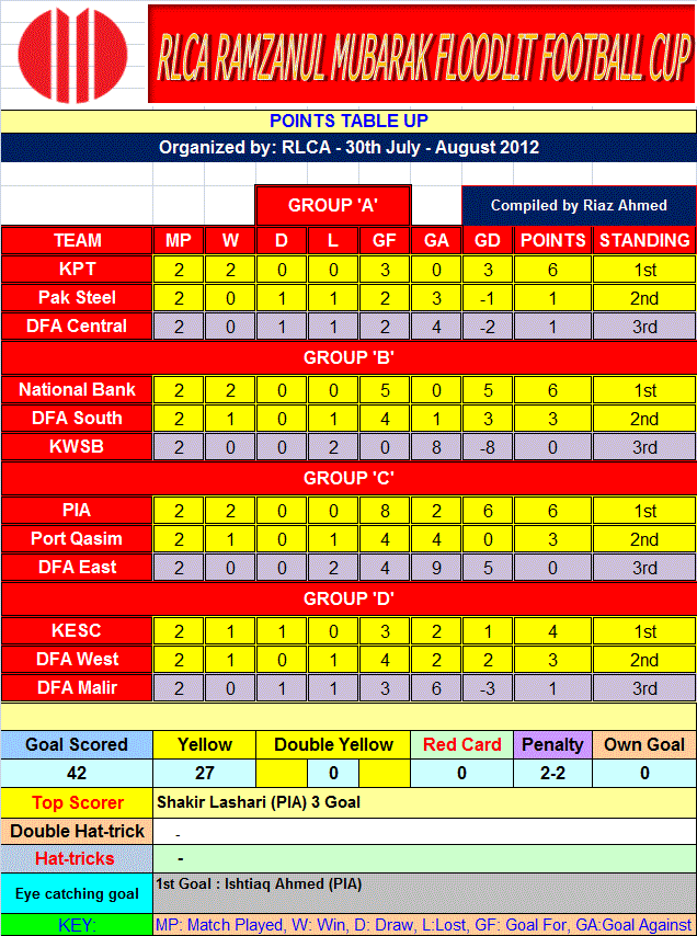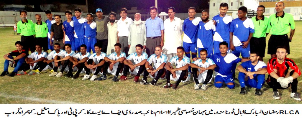 The group stage of the 1st RLCA All-Pakistan Ramazan ul Mubarak Floodlit Football Cup reached its conclusion last night, 8 August 2012, when Karachi Port Trust (KPT) topped Group A with a narrow 1-0 win over Pakistan Steel at the RLCA Ground in Korangi #5, Karachi.