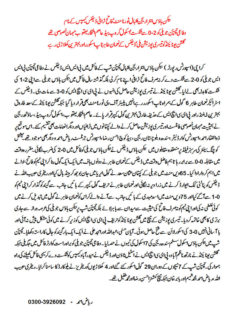 Second goal of the final scored in the 75h minute by Noman Tahir when he received a beautiful cross from left winger Asad Mehdi. Noman no mistake for entering the ball into net as BSS Defence successfully clinch the title and break the consecutive success of Jubilee, they dominated in the championship for many years.