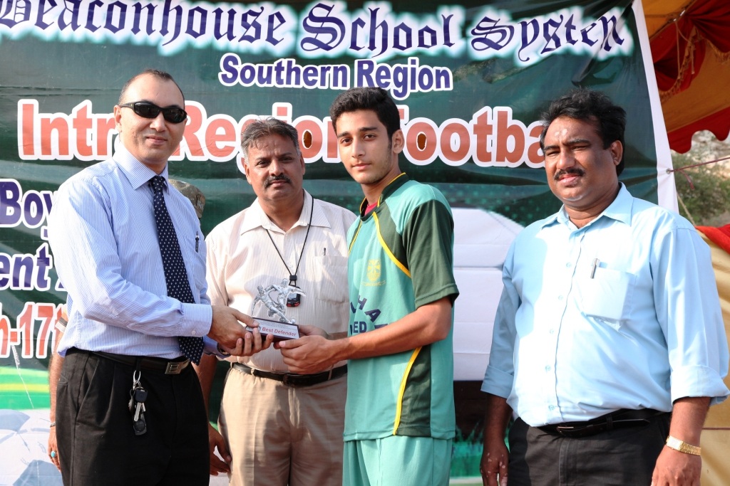 BSS Defence was presented with Winners’ Trophy from the Cheif Guest Mr. Asim Iftikhar Yakub, School Group Head for Southern Region, with BSS Jubilee and BSS Gulshan United collecting their respective position trophies. BSS Defence striker Noman Tahir was given top scorer award with 6 goals and also declared Player of the tournament, BSS Gulshan Saad Farooq declared Best Defender and BSS PECHS Huzaifa Tariq Best Goal keeper. Also present were Zulfiqar Ahmed, BSS Regional Coordinator, Head Coach Ahsan Raza, Mr. Tufail and Mr. Riaz Ahmed Sports Journalist.