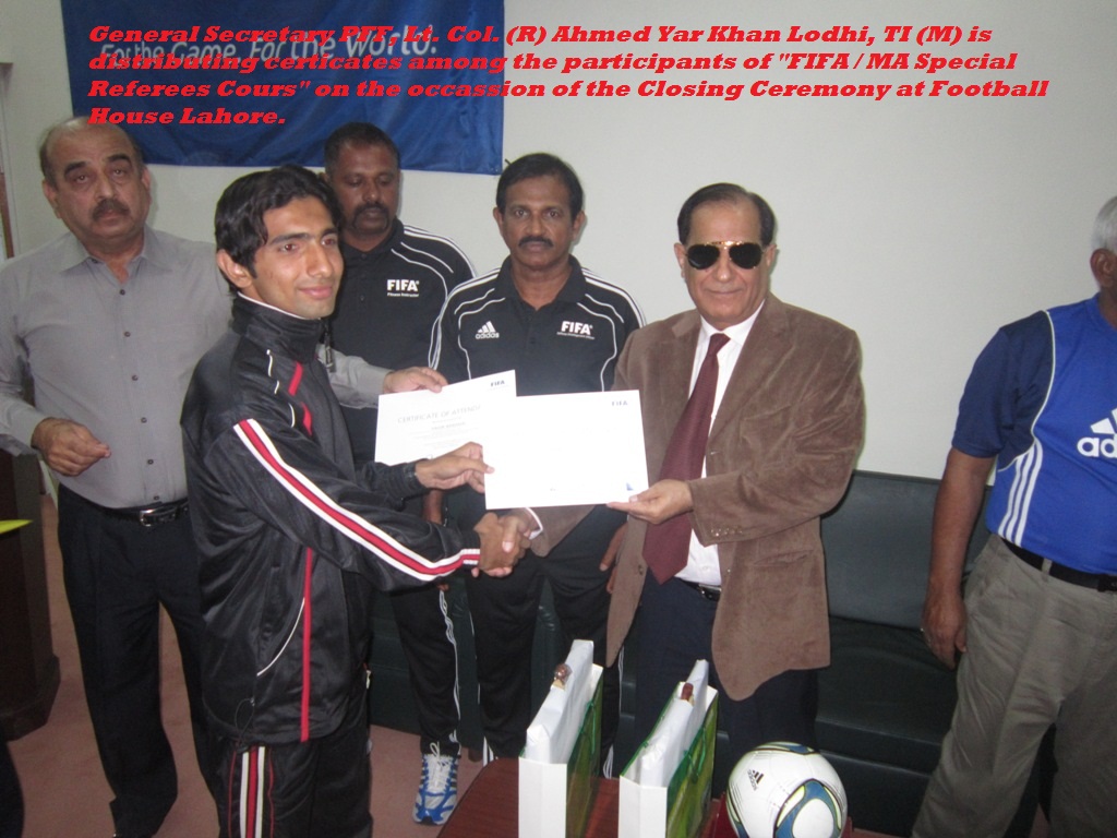 FIFA MA Special Referees Course-2012 concluded today morning at Football House Lahore with Lt. Col. ® Ahmed Yar Khan Lodhi TI (M), General Secretary PFF, gracing the closing ceremony as chief guest, Wing Com. Pervaiz Saeed Mir, Director Development & Competition was also present on this occasion.