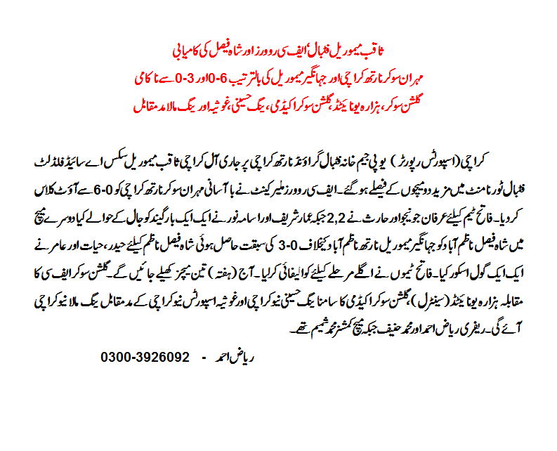 FC Rovers easily win over Mehran Soccer 6-0. Irfan Junejo and Haris scored two goals each while Ammar Sharif and Usama Noor netted one goal apiece for winners. Shah Faisal Nazimabad beat Jahangir Memorial 3-0. Haider, Hayat and Amir Khan netted one each for Shah Faisal.