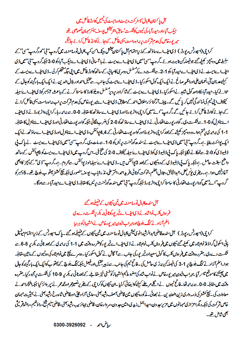 The All-Sindh Qazi Abdur Rasheed Bhatti Invitational Football Cup saw 3 games being played at Municipal High School Ground in Nawabshah under auspices of Pak Sports FC.