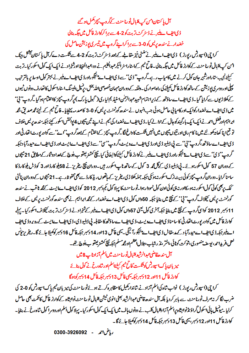 Aslam Azad beat tournament hosts Pak Sports FC in an all-Nawabshah clash at Municipal High School Ground 2-0. A goal in each half from Aslam and Shahrukh granted Aslam Azad a surprising victory.