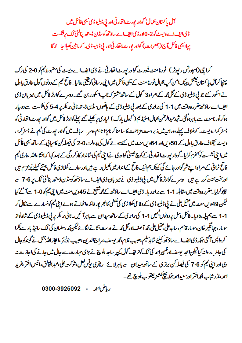 Gwadar Port Authority had to face stiff resistence from DFA West in first quarter-final, but they eventually prevailed 2-0. Second half goals from Tariq Badal (50′, 64′) helped GPA reach the semi-finals. GPA coach Essa Gwadari was confident of his side winning tournament and said that he has full faith in his squad delivering success.