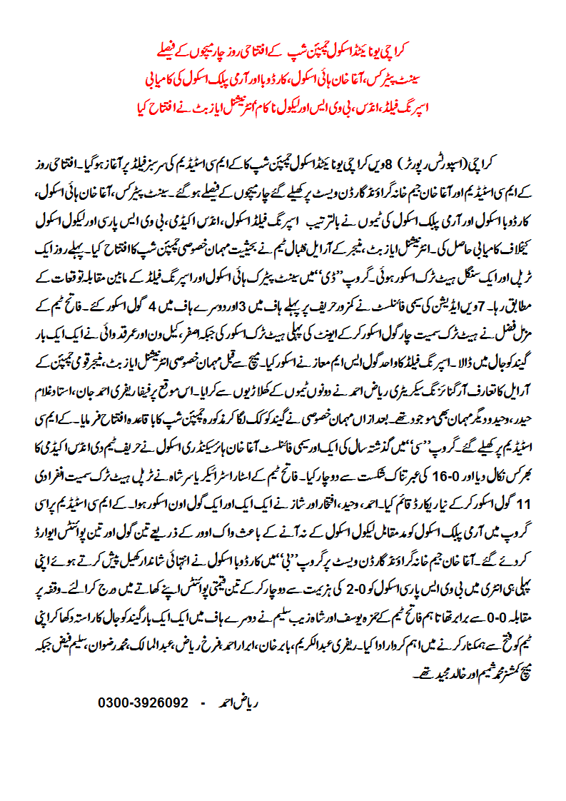 In Group “B” match played at Aga Khan Gymkhana Football Ground, Garden West Cardoba School thrilling win over BVS Parsi School 2-0. The match remained goal less at half time. However, Hamza Younis 46th and Shahzeb Saleem 51st scored for Cardoba School and got three valuable points for his team.