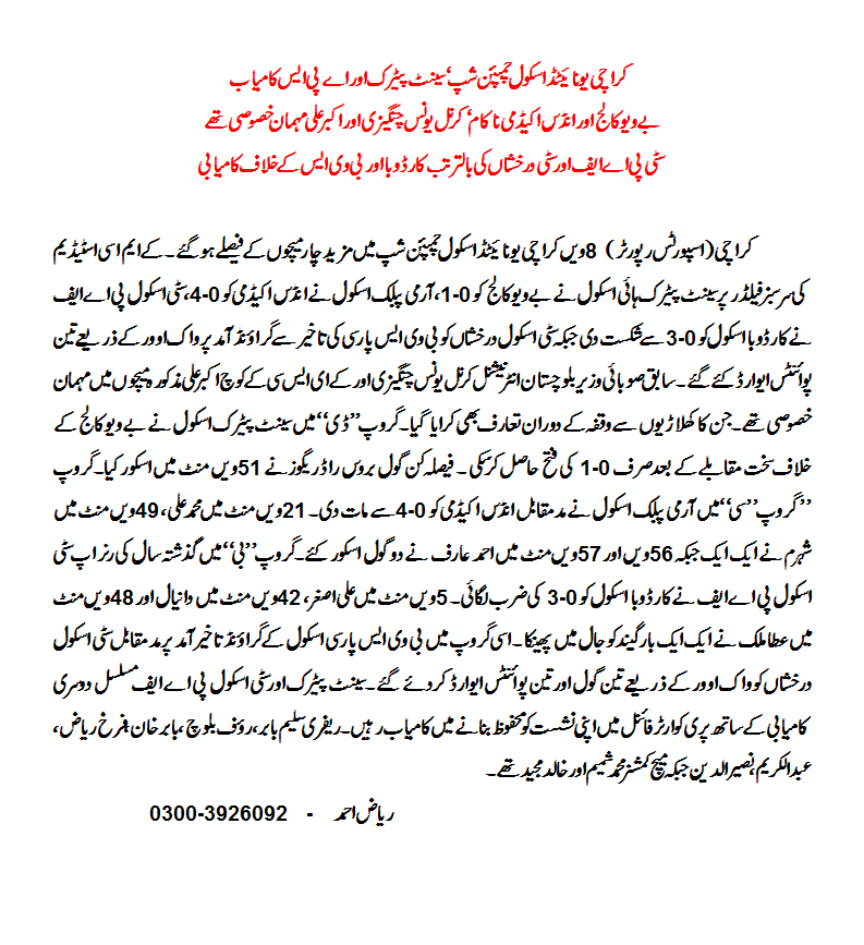 The 8th Karachi United Schools Football Championship 2013 saw 4 more results at KMC Stadium in Karachi on 20 January 2013.