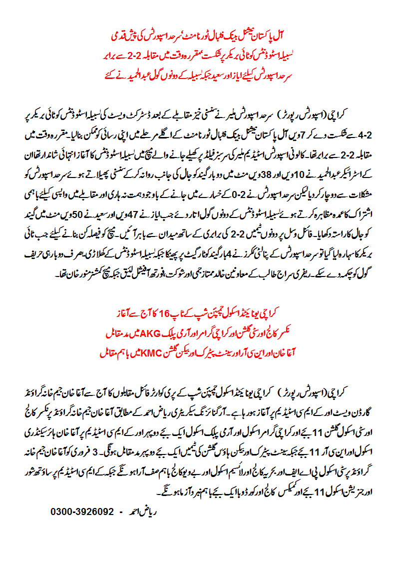 Abdul Hameed of Lasbella Students scored two beautiful goals in the 10th and 38th minute but his team could not maintained at full time. Sarhad Sports splendidly well in the second half and levelled the score through Ayaz 47th and Saeed 50th. The match 2-2 at final whistle. To make the match decided on penalty shootout in which Sarhad Sports entered the ball into net 4 time but Lasbella Students only two.