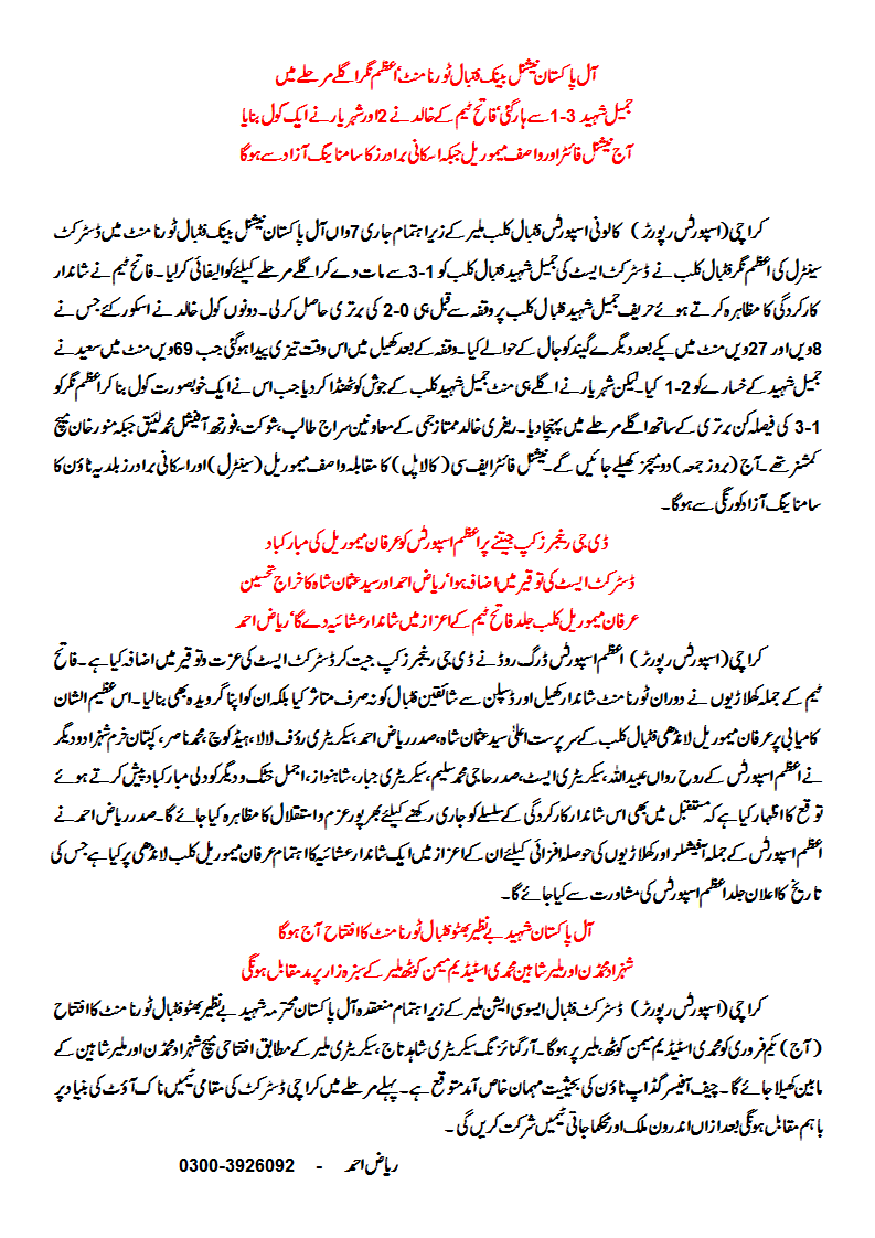 Azam Nagar took 2-0 lead at half time. Striker Khalid scored both the goals for the winners in the 8th and 27th minutes. In the 2nd half Jameel Shaheed played well and scored one goal through Saeed in the 69th minute but Sharyar netted in the next minute for Azam Nagar and consolidated the lead 3-1.