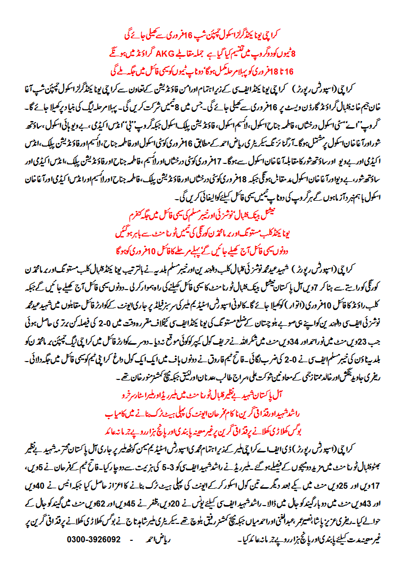 2 more games of the event were decided. Malir Reds beat Rashid Shaheed FC 5-3. Farhan scored a hat-trick while Anees scored twice for Malir Reds. Younas and Zafar (2) responded for Rashid Shaheed.