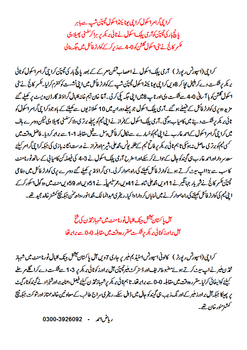 Faisal, Inayat, Shehzad all scored from the sport for Shahbaz Mohd while only Aurangzeb could respond for All Brothers.
