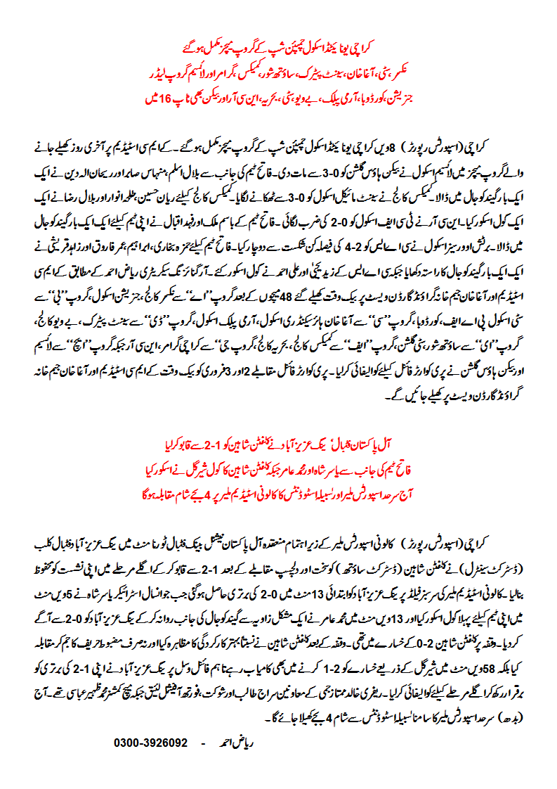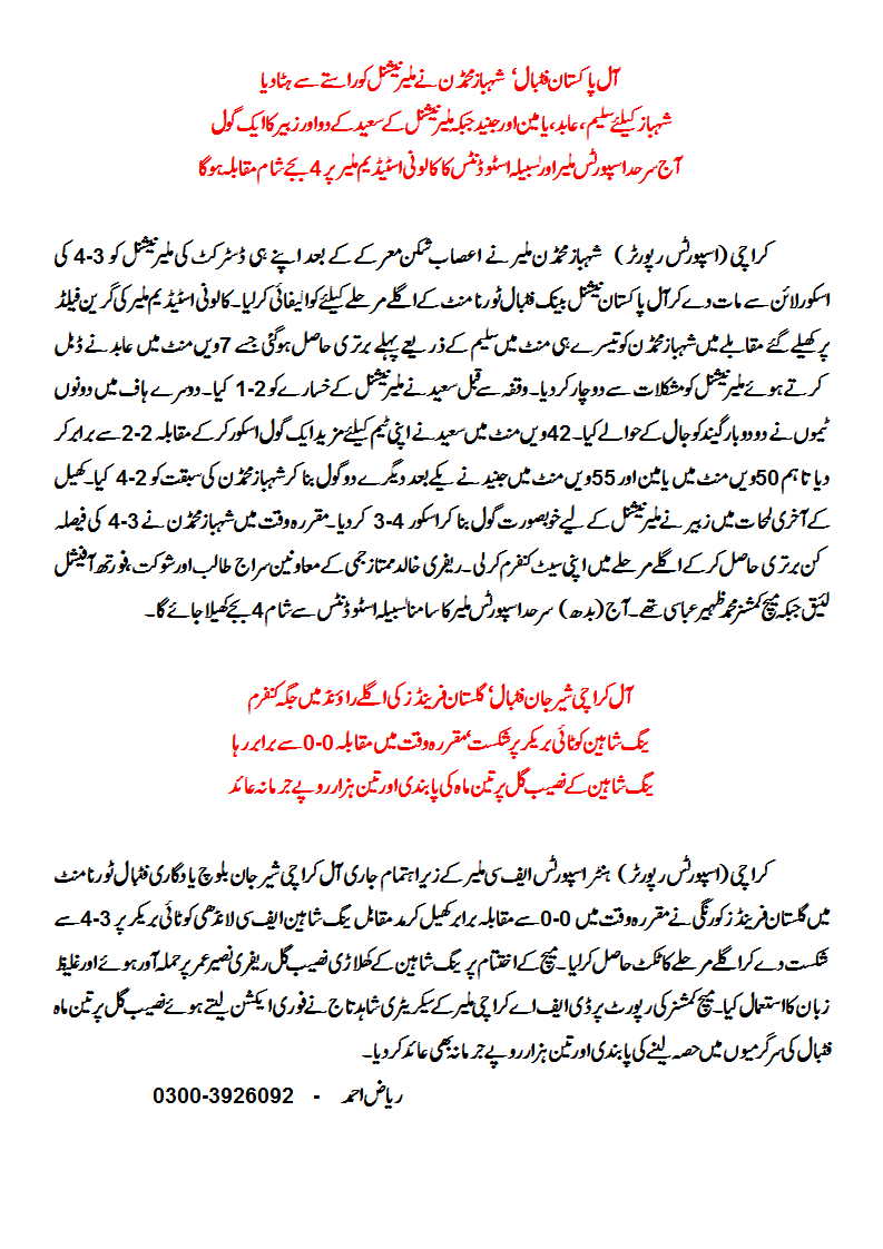 In other events, the All-Karachi Sher Jan Baloch Memorial Football Tournament hosted by Hunter Sports FC (Malir) saw Gulistan Friends (Korangi) beat Young Shaheen FC (Landhi) on penalties 4-3 after a cagey 0-0 draw.