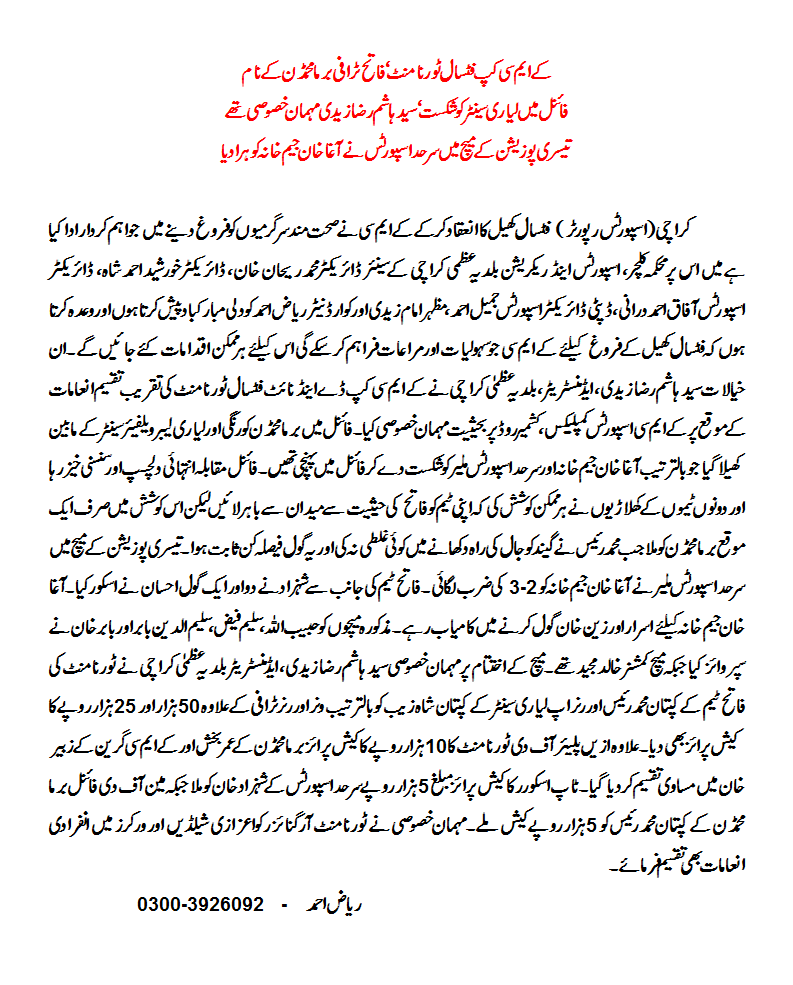 Later KMC administrator Hashim Raza Zaidi, being the chief guest of the prize distribution ceremony, promised that KMC would continue to organise such events of a popular sport. He recalled that when he was getting education in England his residence was near to the world famous football club of Manchester United, so he himself is a fan of this game and knows the importance of this beautiful game which is gaining popularity in Pakistan.
