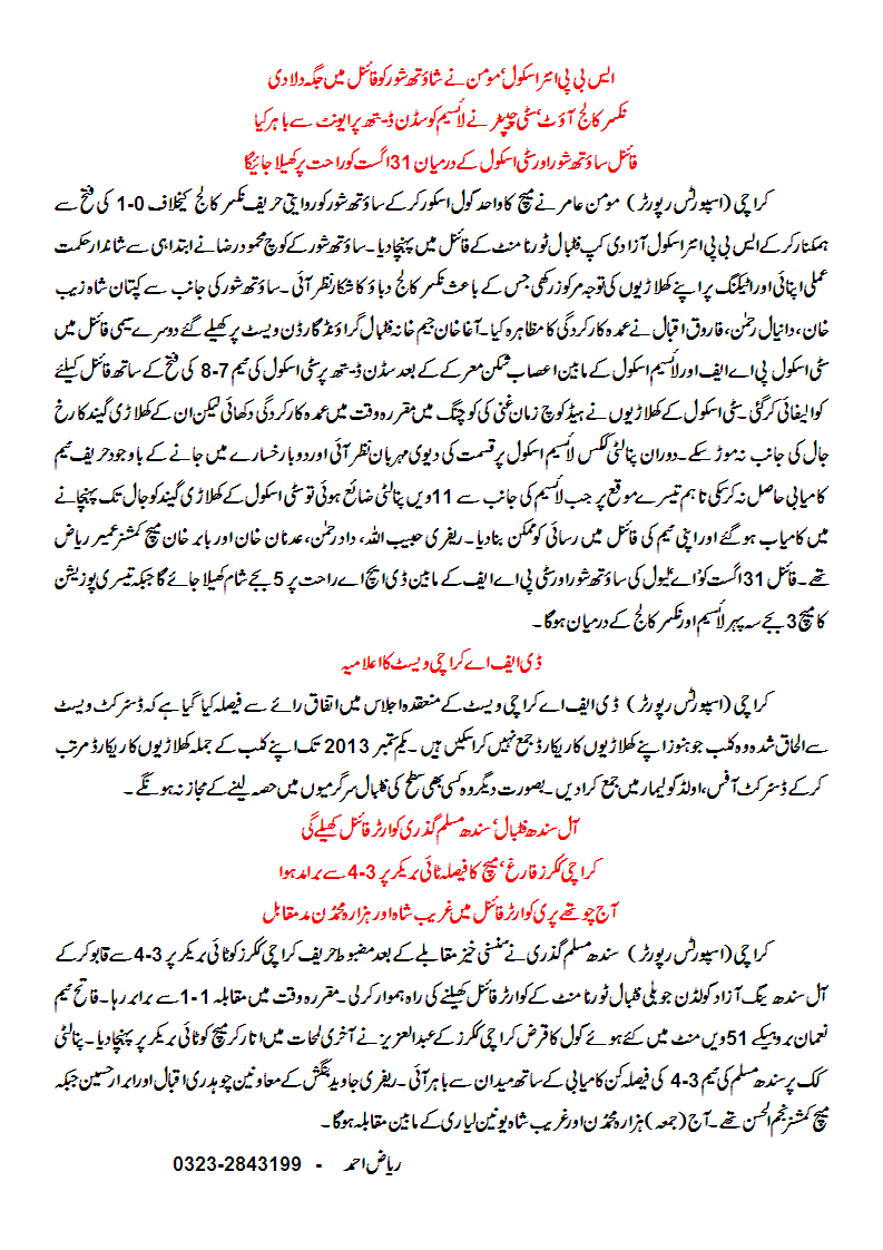 August30August 30, 2013Karachi Football Round Up – 29.8.2013By Malik Riaz Hai NaveedIn Other National Competitions