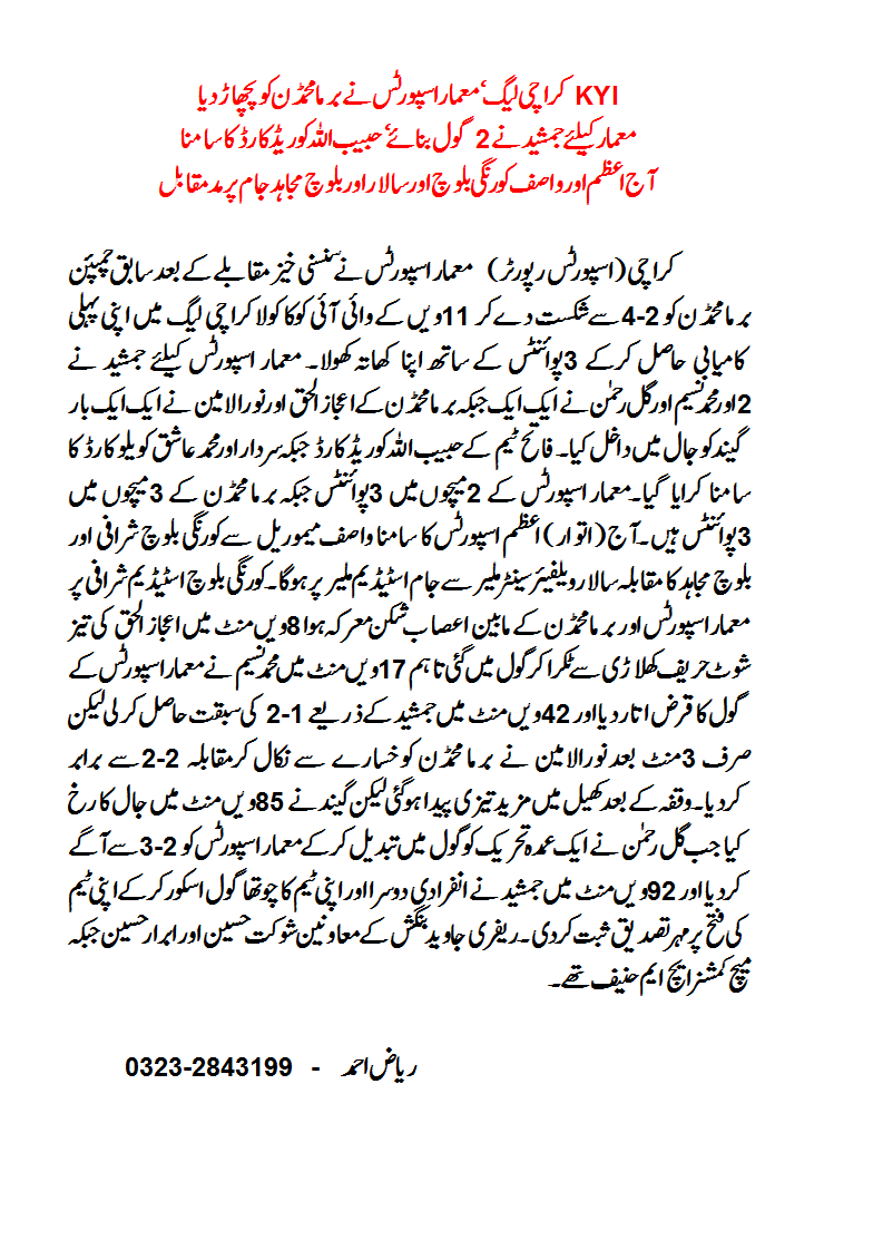 ymar Sports (4) : M. Nasim 17, Jamshed (2) 42, 90+2, Gul Rehman 85