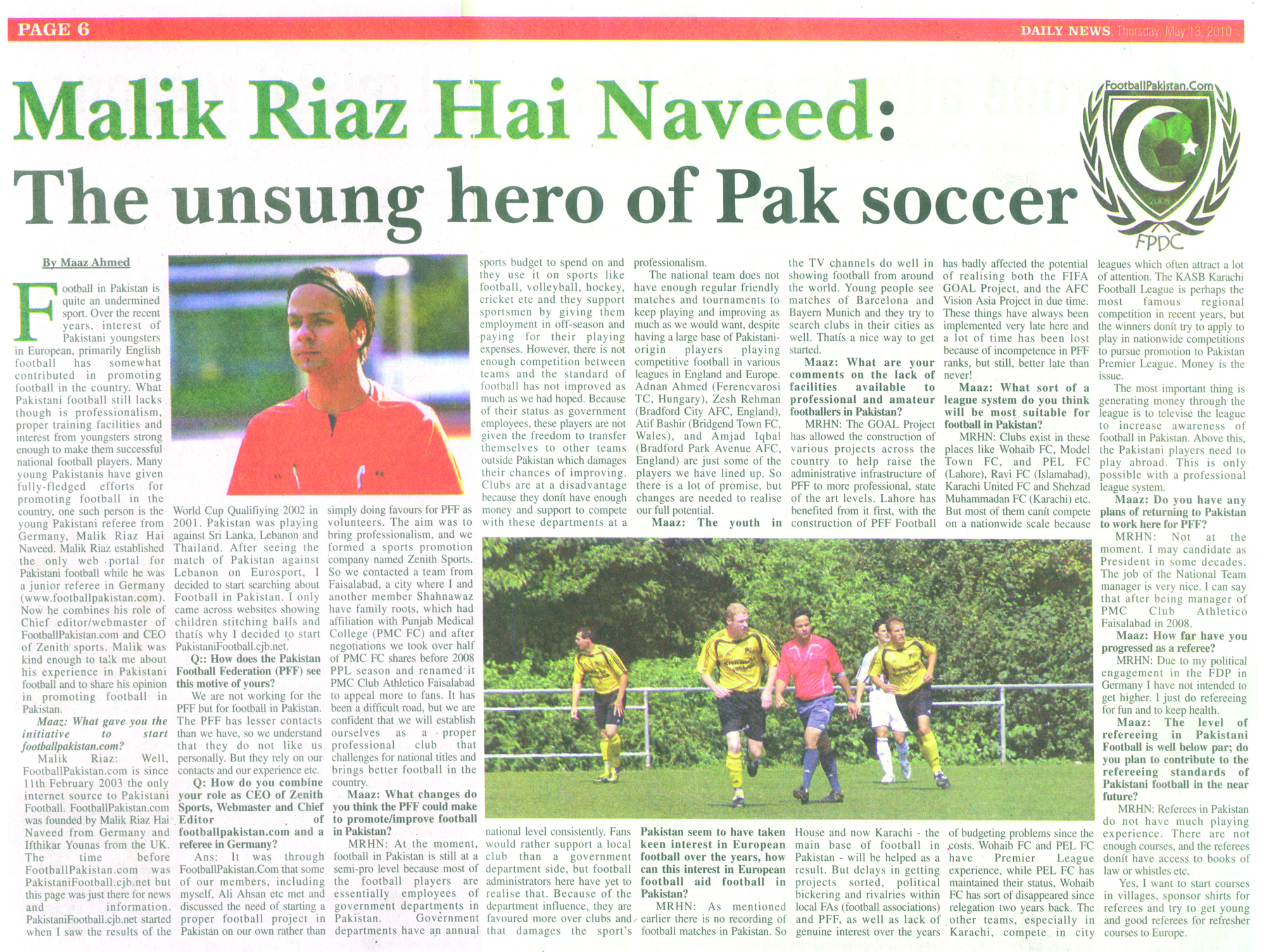 “I wrote about matches and National championships, mainly gathering information from Jang, DAWN and the Nation. Soon after Islamabad Football Association (IFA) official Sharafat Bukhari got in touch with me via email and provided me with scanned newspapers for even more regular information on Pakistani football.”