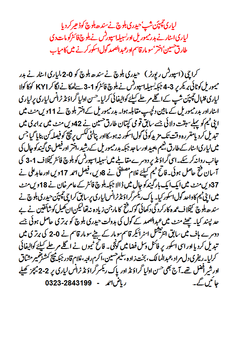 Lyari Star beat Bader Memorial 4-3 on pso after 1-1 draw.