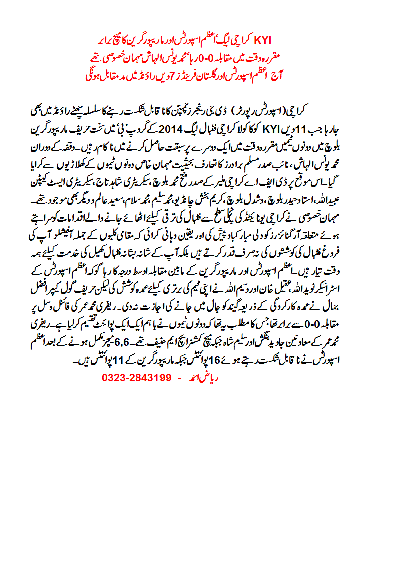 Azam Sports and Mauripur Green Baloch 0-0 draw in the 11TH KYI COCA COLA KARACHI LEAGUE -2014 at Korangi Baloch Stadium Sharafi. Azam Sports 16 points from 6 matches and the same number of matches has been played by Mauripur Green Baloch but their points are 11.