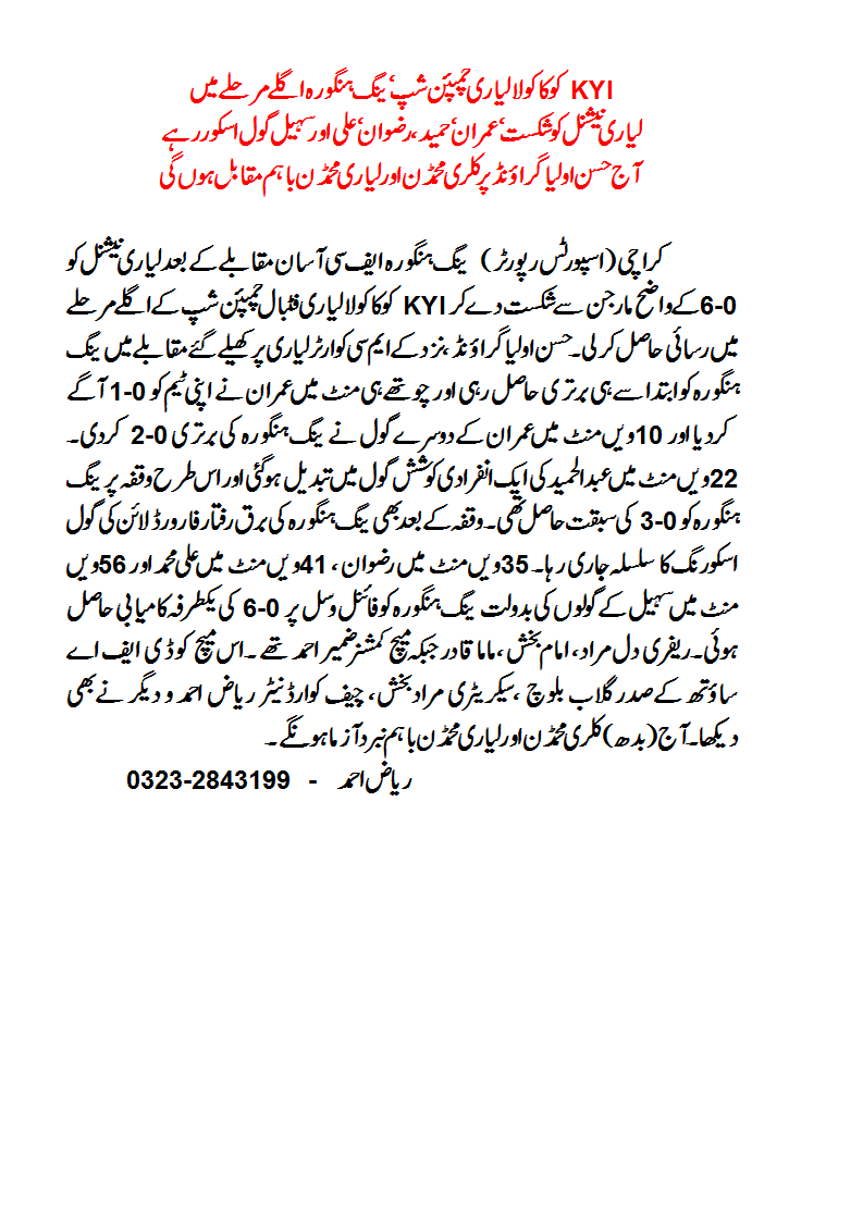 Young Hangora thrashed Lyari Nationl 6-0 and qualfied for second round of KYI COCA COLA LYARI FOOTBALL CHAMPIONSHIP – 2014 being organized by Karachi United Football Foundation at Hassan Olia Football Ground, Near KMC Market Lyari.