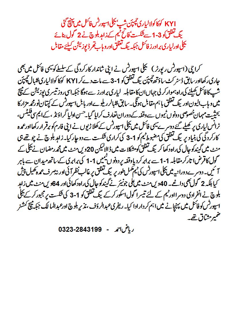 Bijli Sports qualify for final of KYI COCA COLA LYARI FOOTBALL CHAMPIONSHIP 2014 after beating former DFA South Champion Young Tughlaq at Hassan Olia Ground, KMC Flats, Trans Lyari being organised by Kararchi United Football Foundation.