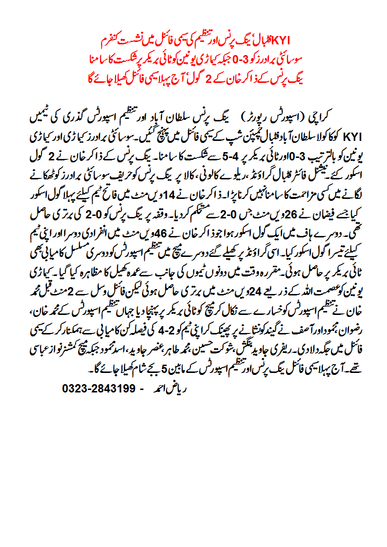 Young Prince beat Society Brothers 3-0 and moved into Semi Final. Zakir Khan (2) 14,46 and Faizan netted in 26the minute.