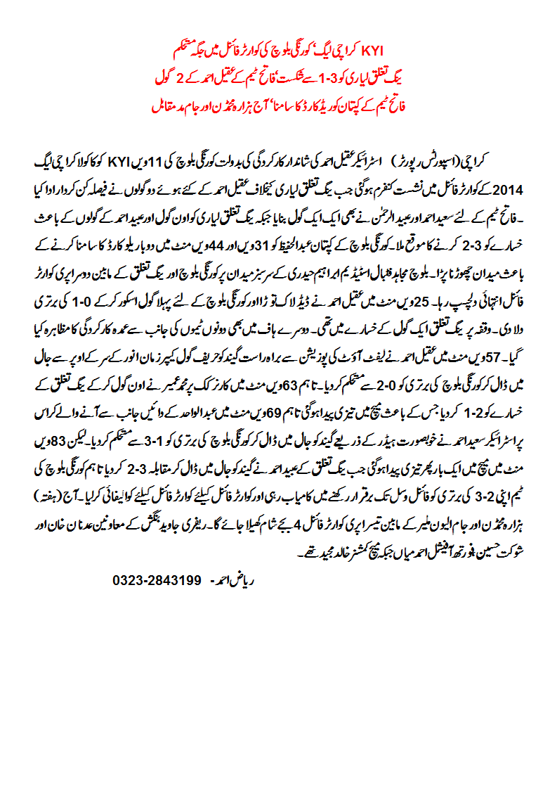 Korangi Baloch Sharafi defeated Young Tughlaq Lyari 3-2 and moved into quarter final of 11th KYI Coca-Cola Karachi League – 2014 being orgaqnised by Karachi United Football Foundation at Baloch Mujahid Stadium Ibrahim Hydri.