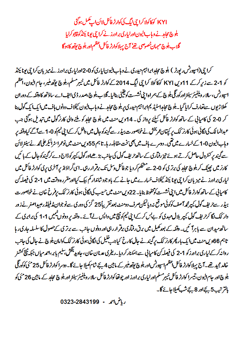 The Pre Quarter Finals of 11TH KYI COCA-COLA KARACHI LEAGUE 2014 have been completed. Khyber Muslim Baldia, Lyari Brothers, Jam XI, Azam Sports, Baloch Youth Malir, Baloch Mujahid, Salar Welfare Centre Malir and Korangi Baloch Sharafi moved into Quarter Final.
