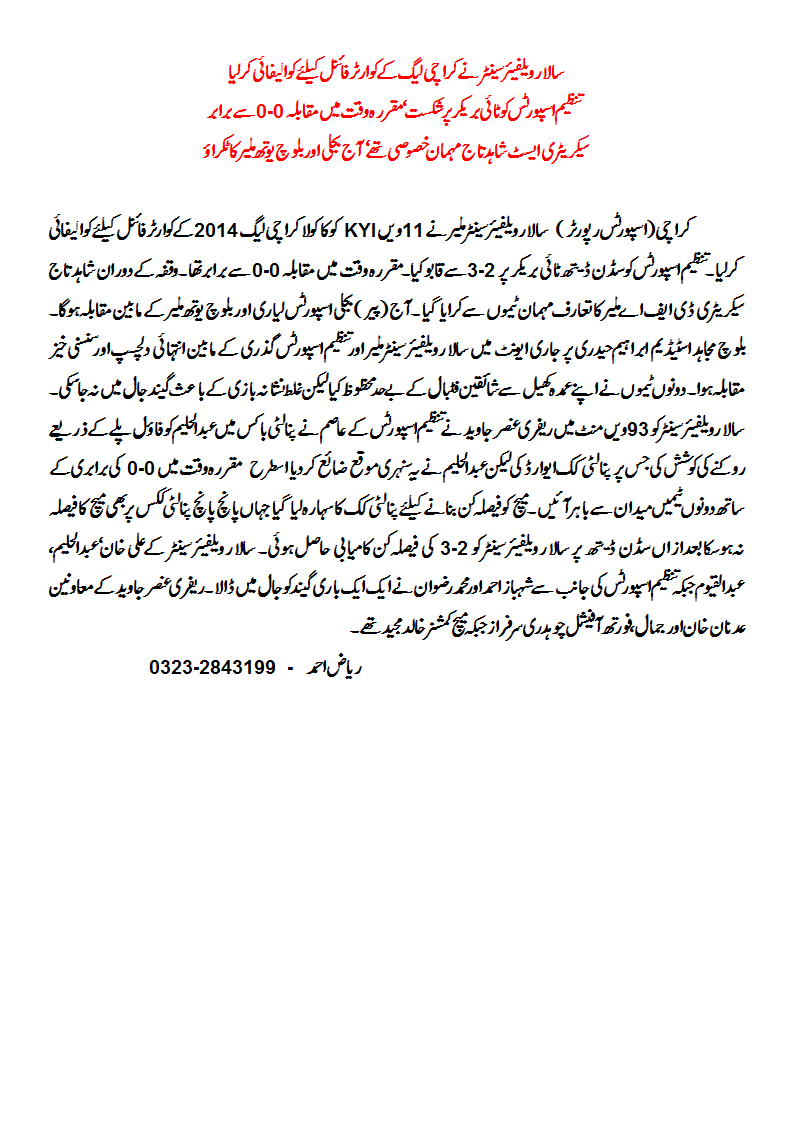 Salar Welfare Centre Malir thrilling win over Tanzeem Sports Gizri 3-2 on sudden death penalty kicks and moved into quarter final of 11th KYI Coca-Cola Karachi Leauge 2014 at Baloch Mujahid Stadium, Ibrahim Hydri being organized by Karachi United Football Foundation.