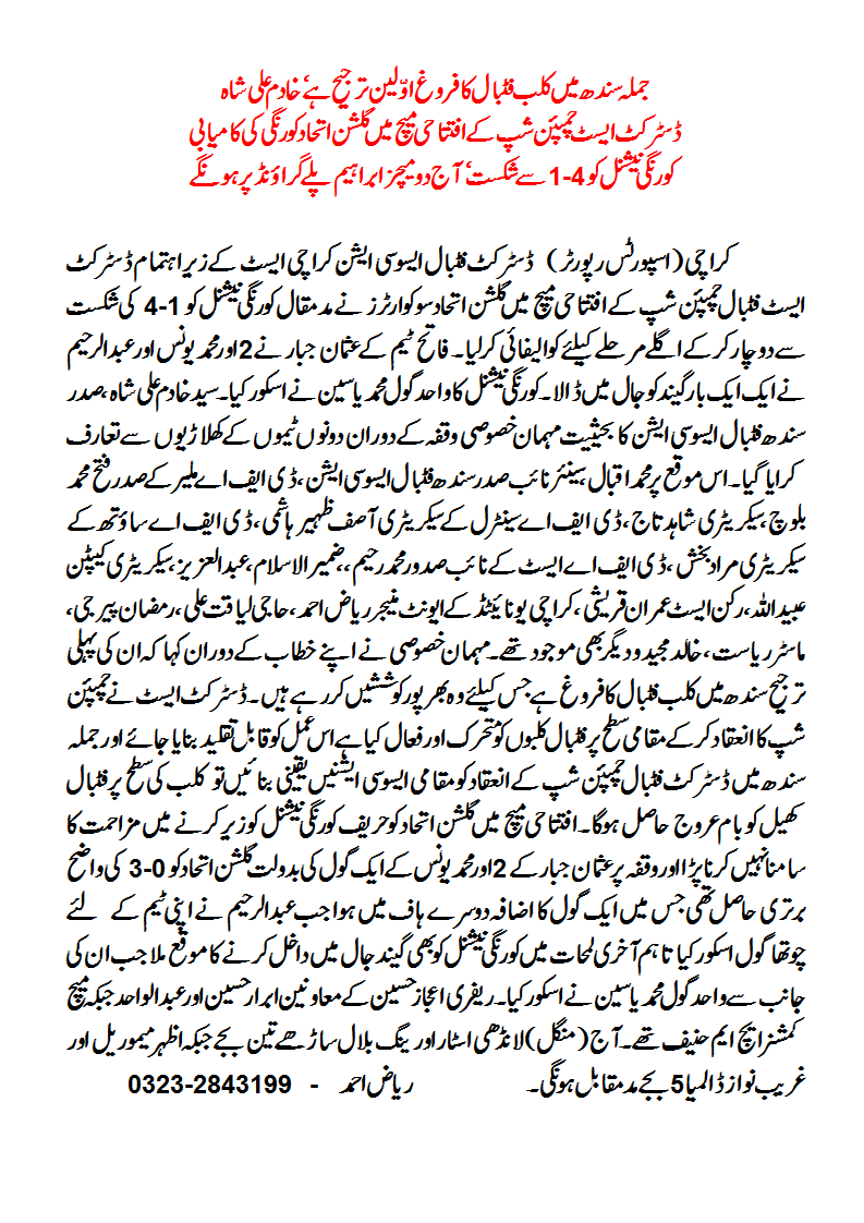 Gulshan-e-Ittehad Korangi defeated Korangi National 4-1 in an inaugural match of District East Football Championship 2014 at Ibrahim Play Ground,, Korangi No.6 being organised by District Football Association Karachi.