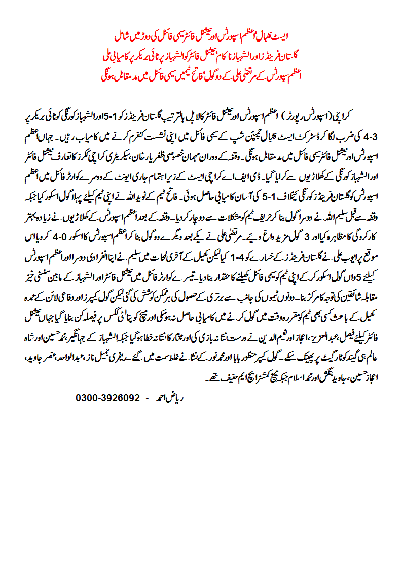 Azam Sports and National Fighter moved into semifinal of District East Football Championship 2014 after beating Gulistan Friends Korangi and Al-Shabaz Korangi at Ibrahim Play Ground Korangi No.6 and Dr. M.A. shah Football Stadium Landhi respectively being organized by DFA East Karachi. Mr. Zafar Yar Khan, Secretary Karachi Kickers introduced with players as Chief Guest during the lemon time.