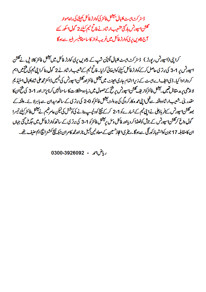 National Fighter took 2 goal lead by Shoaib Irshad at half time. Farhad Ali reduced the margin in 54 minute but Amiri Naeem scored erd goal for National fighter which is maintained at full time. National Fighter will face Al-Shabaz Korangi in Quarter Final on 17th June 2014 at Dr. M.A. Shah Stadium Landhi.