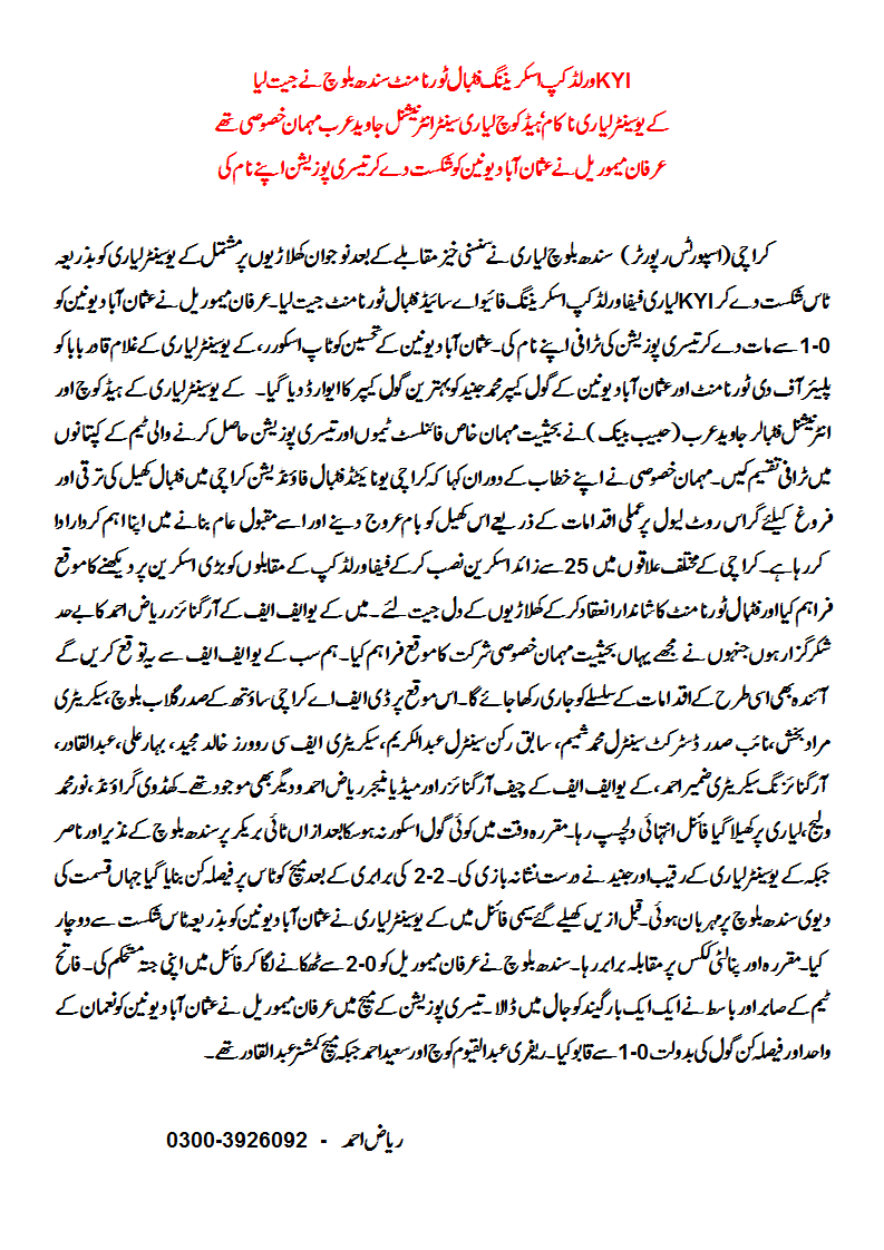 Mr. Gulab Baloch, President, DFA South, Secretary Mr. Murad Bakhsh, Mr. M. Shamim, Vice President, DFA Central, Mr. Abdul Karim, Ex-Member of Central, Mr. Khalid Majeed, Secretary, FC Rovers, Mr. Riaz Ahmed, Chief Organiser and Media Manager KUFF, Mr. Bahar Ali, Mr. Zamir Ahmed and others were present.
