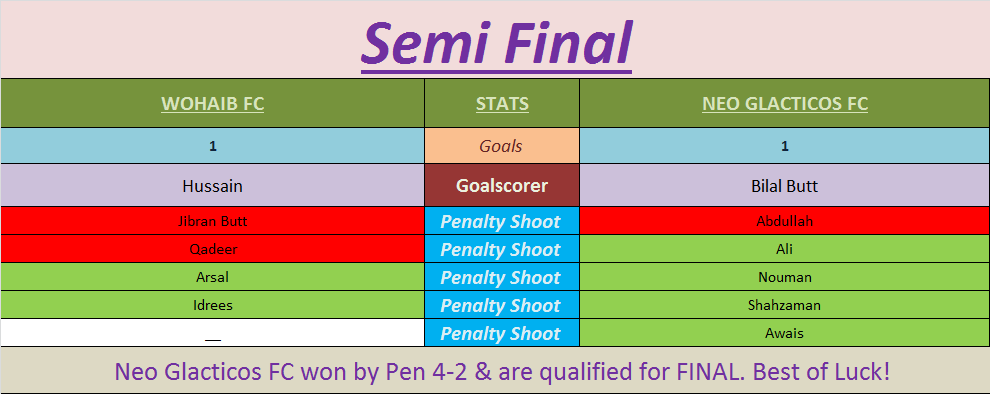 NEO GLACTICOS FC are Qualified for Final against BUBISH FC.