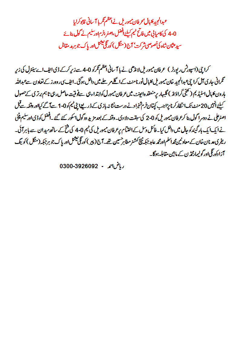 Irfan Memorial Landhi beat Azam Nagar 1-0 and moved into next round of All Karrachi Abdul Majeed Khan Memorial Football Tournament 2014 at Abdullah Haroon Football Stadium (Khajji Ground) Gulbahar being organised by Golden Star FC with collaboration of DFA Central Karachi Central.