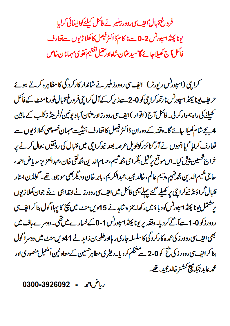 Dr. Faisal introduced with the players during the interval as Chief Guest. Ex- Captain Pakistan Football Team M. Naqi Khan, Aqeel Bilgrami, M. Shamim, Haji Shamimuddin, Riaz Ahmed, Hassamuddin, Abdul Karim, Khalid Majeed, Babar Khan and others were also present on the occasion.