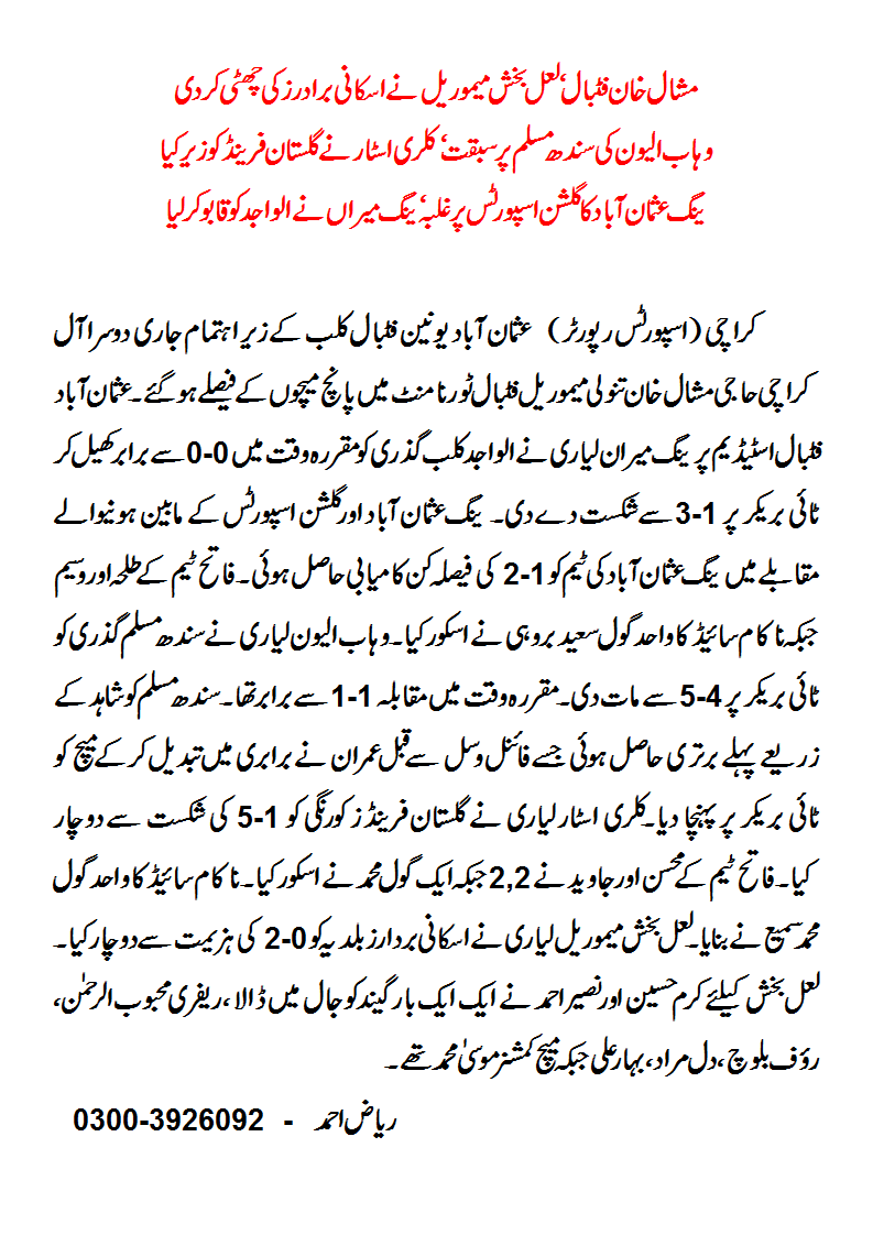 5 matches have been decided in end All Karachi Mishal Khan Tanoli Memorial Football Tournament 2014 at Usman Football Stadium being organised by Young Usmanabad Union.