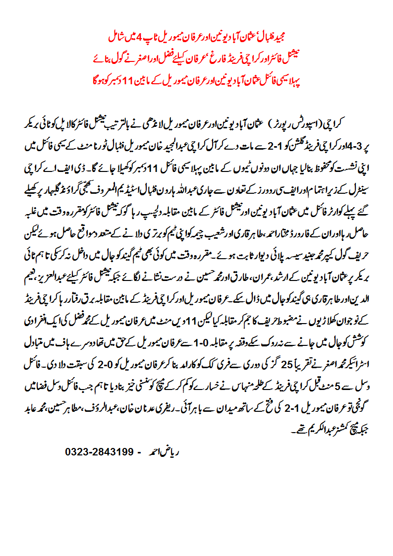 M. Fazal and M. Asghar scored one goal apiece for Irfan Memorial while Talha Minhas reduced the margin.