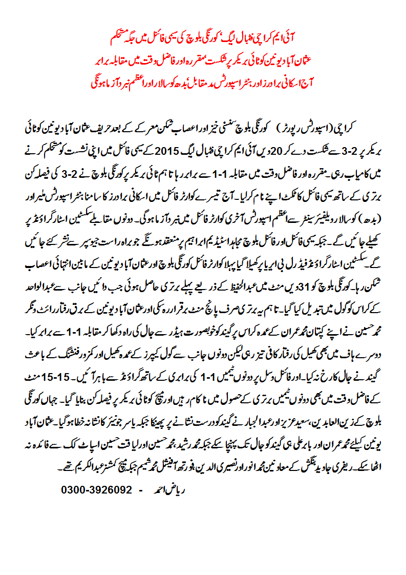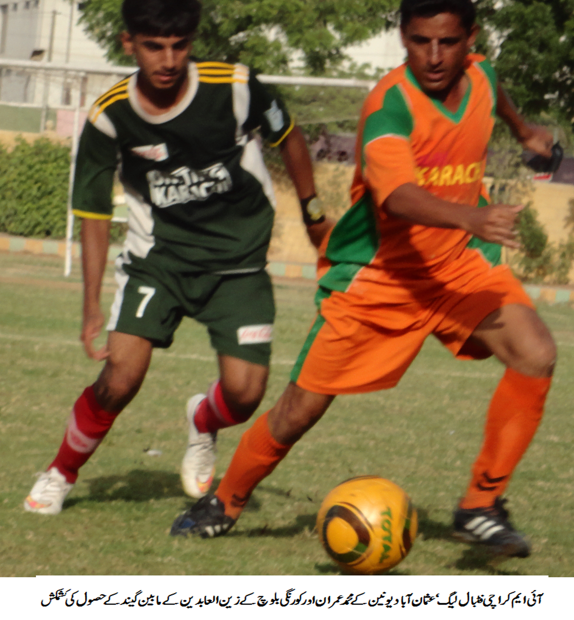 Korangi Baloch captain Abdul Hafeez converted a right winger Abdul Wahid cross into goal in 31st minute but speedy winger Mohammad Hussain equalised by a beautiful header 5 minutes later.