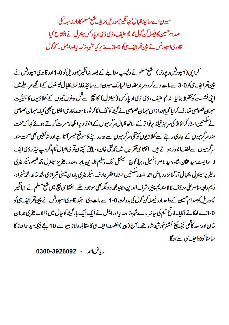 Shama Muslim defeated Jahangir Memorial by 1-0. Decisive goal scored by Saddam Hussain in 34th minute. Qadri Sports beat Penther FC 3-0. Sheroz, Hadeer and Aymal netted once for the winners.
