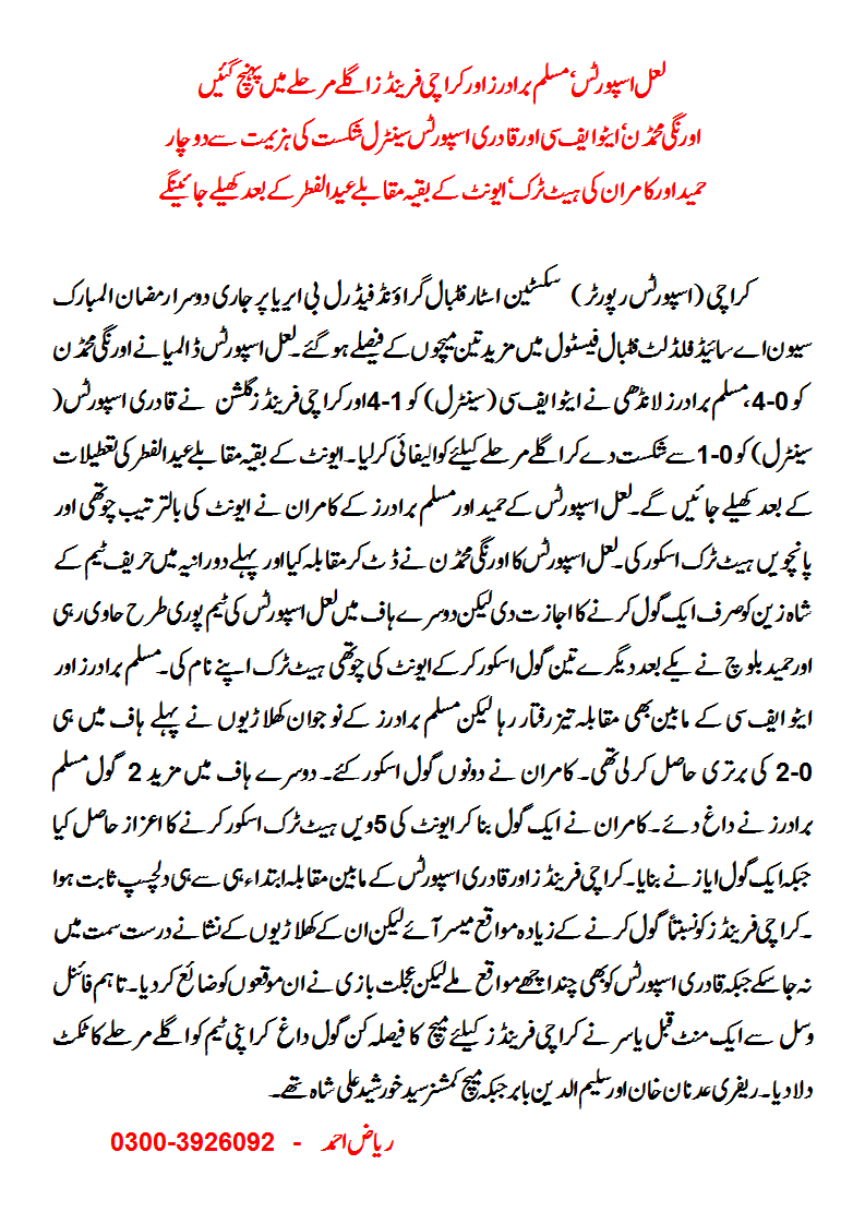 Three more matches have been decided in 2nd Ramzan ul Mubarak Seven a Side Football Festival 2015 at Sixteen Star Football Ground, FB Area, Karachi.