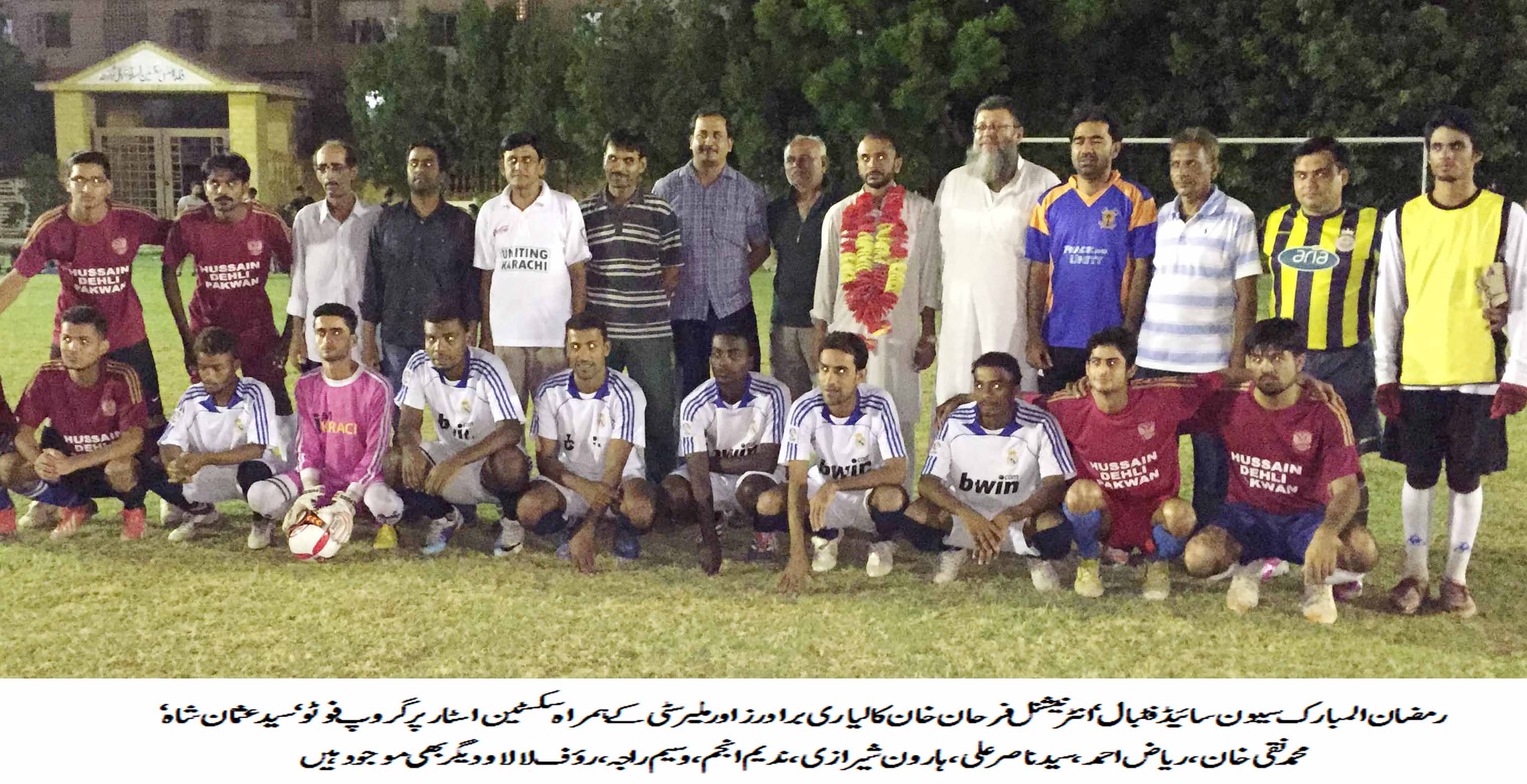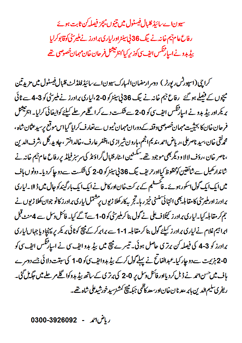 Rafa-e-Aam Gymkhana Malir defeated Young 36-B Centre Landhi, Lyari Brothers beat Malir City 4-3 on penalty shoot out and Badbado FC thrashed Spartings FC 2-0 in 2ndRamzanul Mubarak 7-a-Side Flood lit Football Festival 2015 at Sixteen Star Football Ground , FB Area, Karachi. All the Winners moved itno second round.