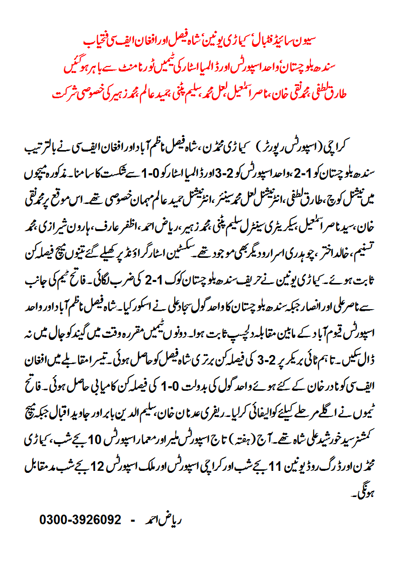 Nasir Ali and Ansar netted one goal apiece for Keamari Union and loan goal scored by Sajjad Ali for Sindh Balochistan. Ex-Inter National Lal Mohammad Senior (K-Electric) introduced with the players during the interval as Chief Guest.