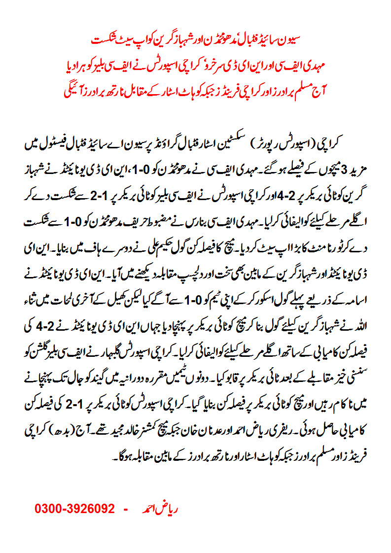 Mehdi Sports defeated Madhoo Mohammedan 1-0, NED United beat Shabaz Green 4-2 pso and Karachi Sports thrashed FC Blaze 2-1 pso and moved into next round of 7 side football festival being organised by Sixteen Star FC Federal B Area, Karachi